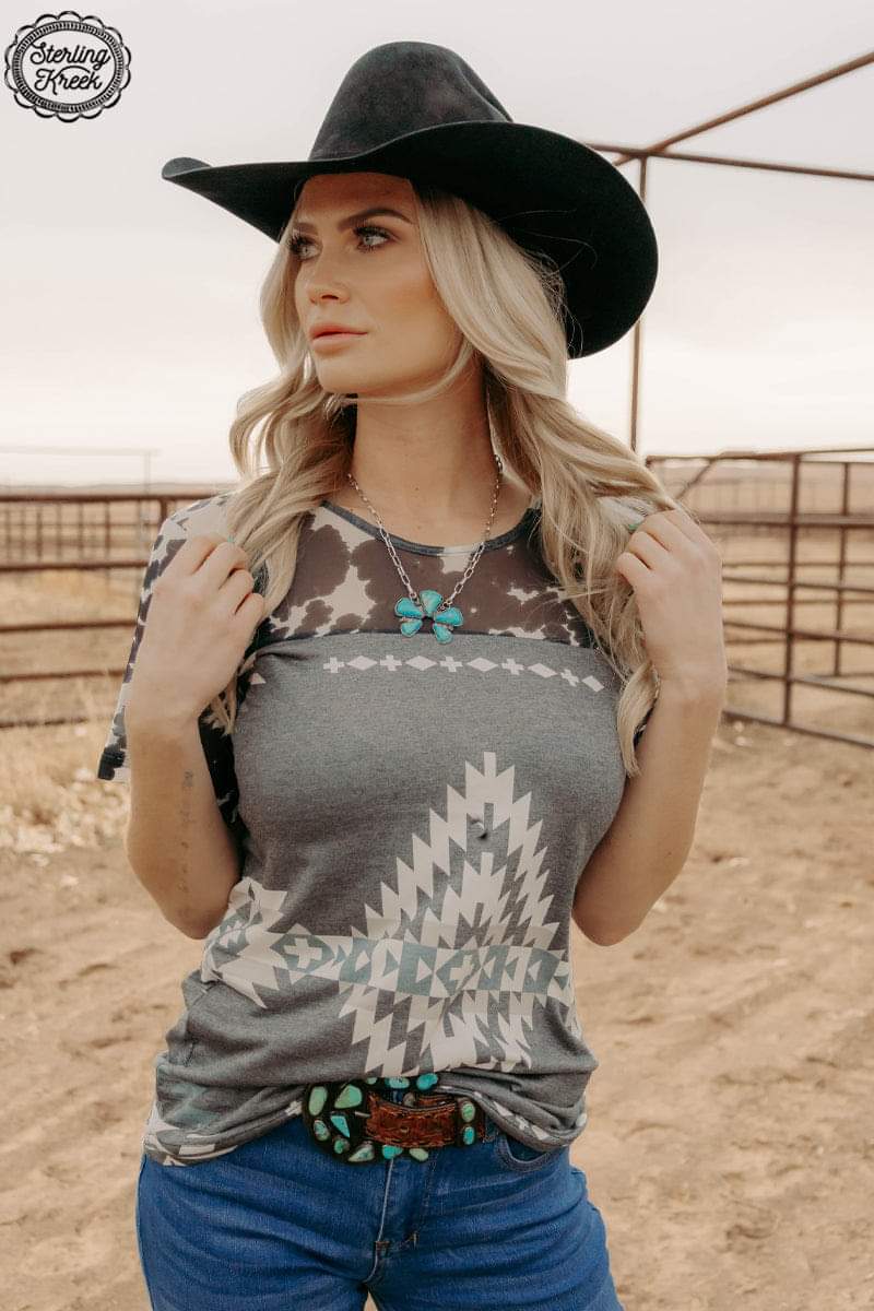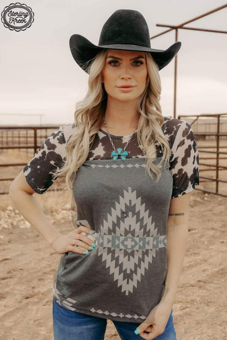 Go moo-ve over boring shirts, the Cow Daze Top is here! This quirky top features a playful mix of cow print mesh and aztec design. Perfect for adding a touch of fun to any outfit. No bull, this top is udderly amazing! (See what we did there?)"