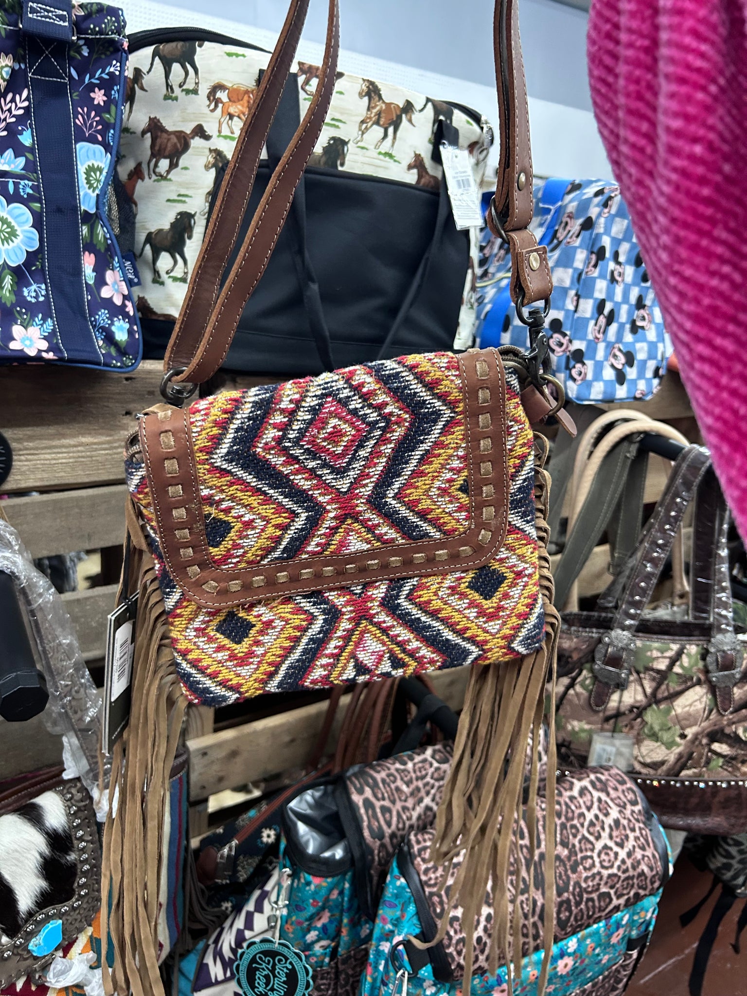 A small sling on bag with embroidery patterns with a slight dash of blue to make it stand out. Right mix of functional and ethic design.