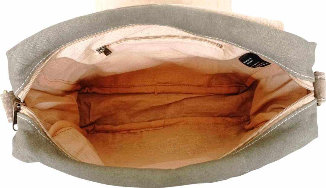 Our recycled military tent cross body features a print patch on the front flap. Top Zipper, 1 interior zipped pocket, fully lined.