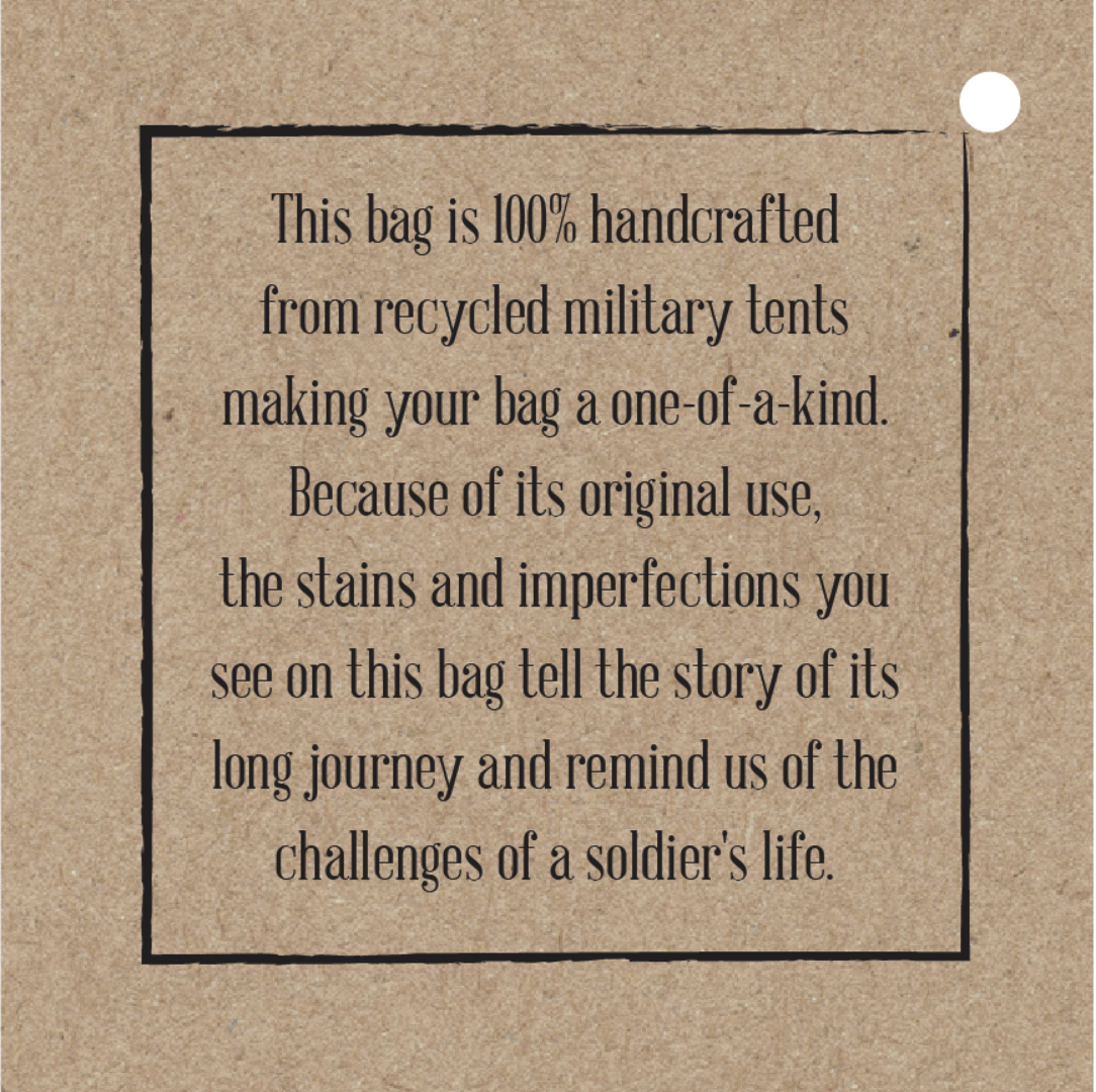 DISCLAIMER: Our recycled military tent bags are a tribute to and a reminder of the sacrifices and contributions of military veterans. Please know that these bags are made from authentic used military tents and are not brand new canvas packaged as recycled tents or tarps. THESE ARE THE REAL DEAL!! As a result, the tent material will show signs of worn-like imperfections which add to its character. Each bag has differences in genuine imperfections, stains, and colors. Your bag will be as unique as each soldier’s experience when seeking shelter in these tents whether in the training field or in a combat zone. All Sales are Final.