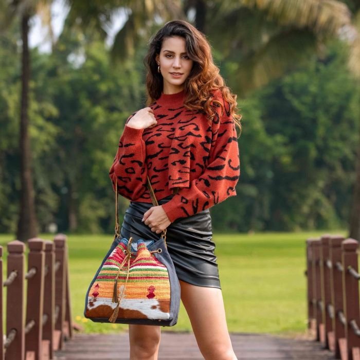 Myra bucket bag. Product pattern varies due to being real cowhide.