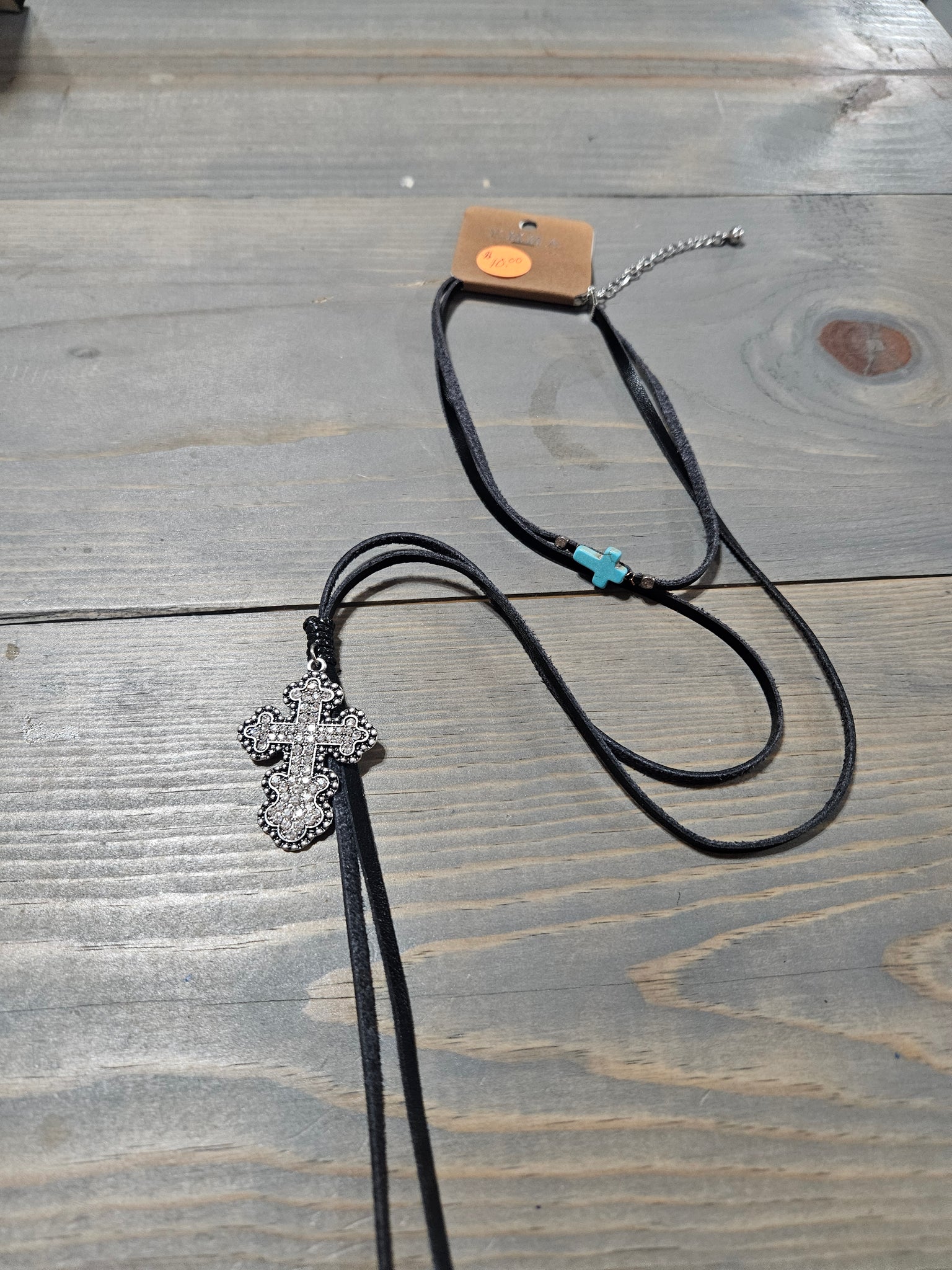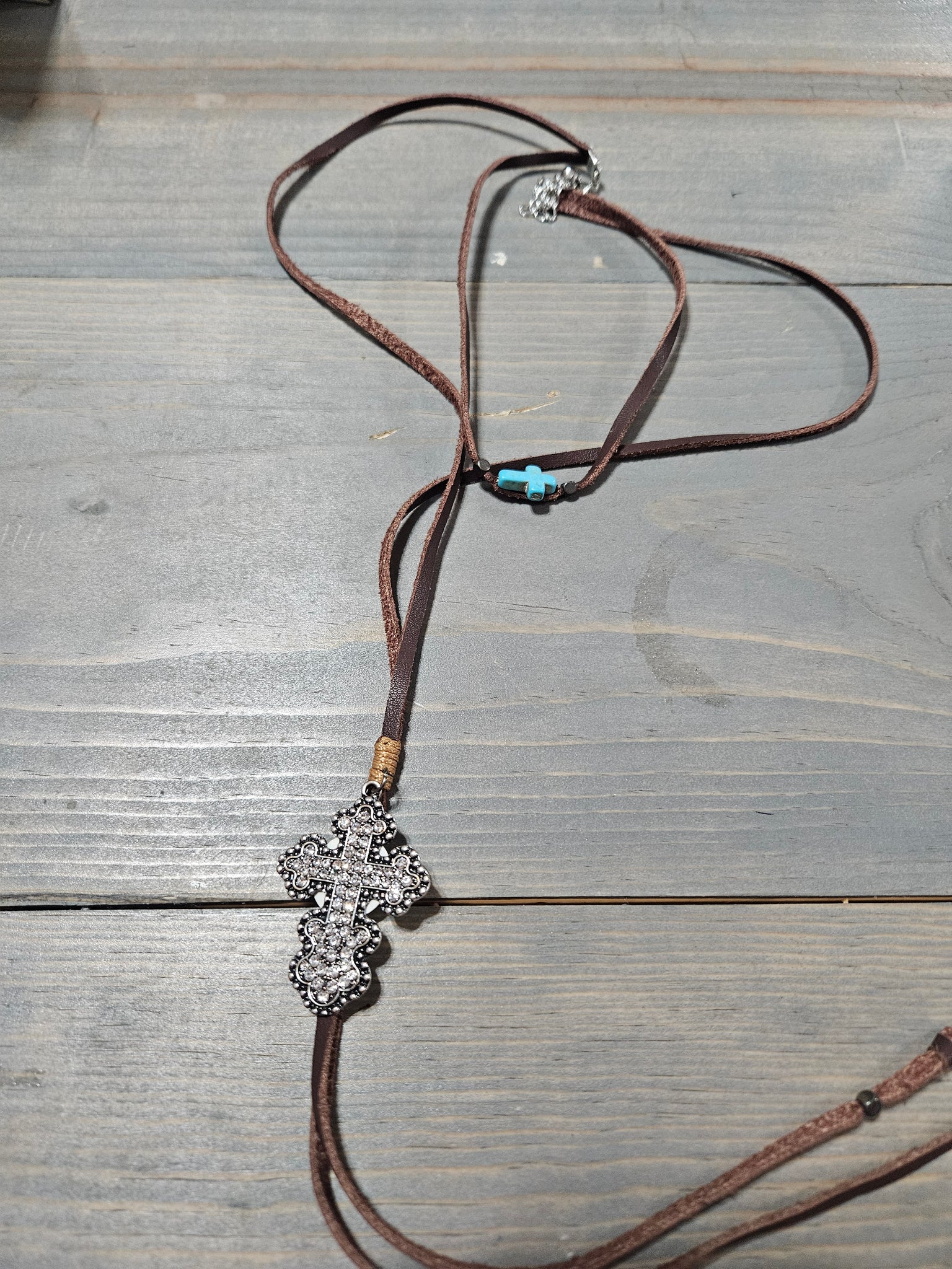 Sparkly Rhinestone cross charm and a blue Stone cross on a leather necklace